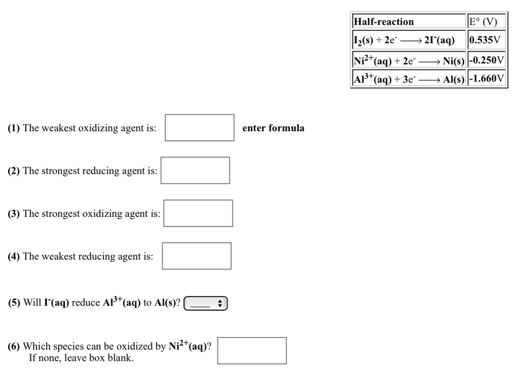Answered Consider The Following Half Reactions Bartleby from prod-qna-question-images.s3.amazonaws.com You just need to arrange it so that the most negative one is the strongest reducing agent. Is electronegativity the factor that determines the strength of reducing agents and oxidizing agents? A good reducing agent has low ionization energy. The species at the top left have the greatest potential to be reduced, so they are the strongest oxidizing agents. Strength of oxidizing and reducing agents What is an example of a reducing agent? Lithium is strongest reducing agent because of lowest standard reduction potential. May 07, 2021 · the standard reduction potentials can be interpreted as a ranking of substances according to their oxidizing and reducing power.